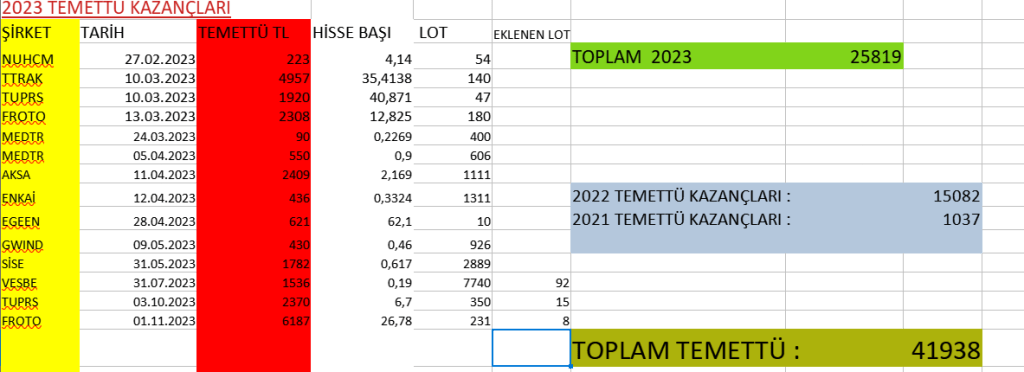 Tablo da 2023 yılı ve öncesinde aldığım temettüleri görebilirsiniz. Geçen ay yatan Ford temettüsü ile yeniden Ford hissesi aldım. Böylelikle birleşik getiriden mümkün oldukça daha fazla yararlanacağım.