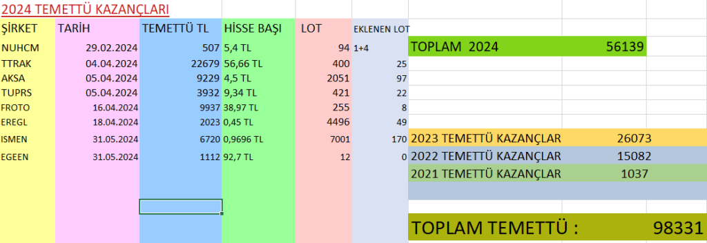 Bu ay #ismen ve #egeen temettüleri yattı. #şişe temettüleri de diğer aya kalacak. Ama #ismen’ den aldığım temettülerle 170 lot #ismen aldım. #egeen temettüsü ile de 4 lot #nuchm ekledim. Temettü tablomu aşağıda paylaşıyorum :