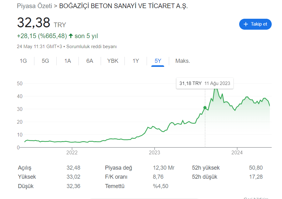2. Şirketin hisse kodu ile google’ a yine investing #bobet yazıp son 5 yılda % kaç gittiğine bakıyorum. Bunun nedeni hikayesi ve değeri olsa bile bu şirketin fiyatlanıp fiyatlanmadığına bakıyorum. Bu arada Fk’ya da bir göz atıyorum. Fiyatlanmadığını düşünüyorsam daha fazla araştırmaya giriyorum.