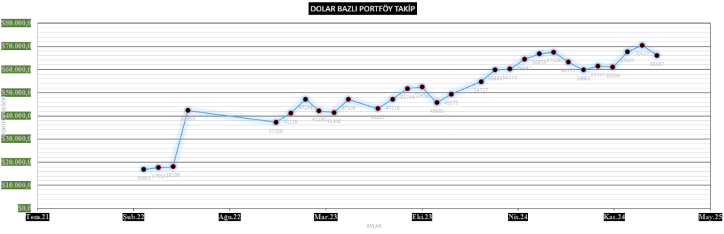 Geçen ay güzel bir yükselişle umut veren dolar bazlı grafiğim, bu ay beklentileri karşılamadı. Uzun süredir yatay seyreden grafik, adeta bir yukarı, iki aşağı hareket ediyor. 🙂 70.000 dolar zirvesi, bana umut vermişti, ancak şimdi tekrar 66.000 dolar seviyesine geriledi. 😞