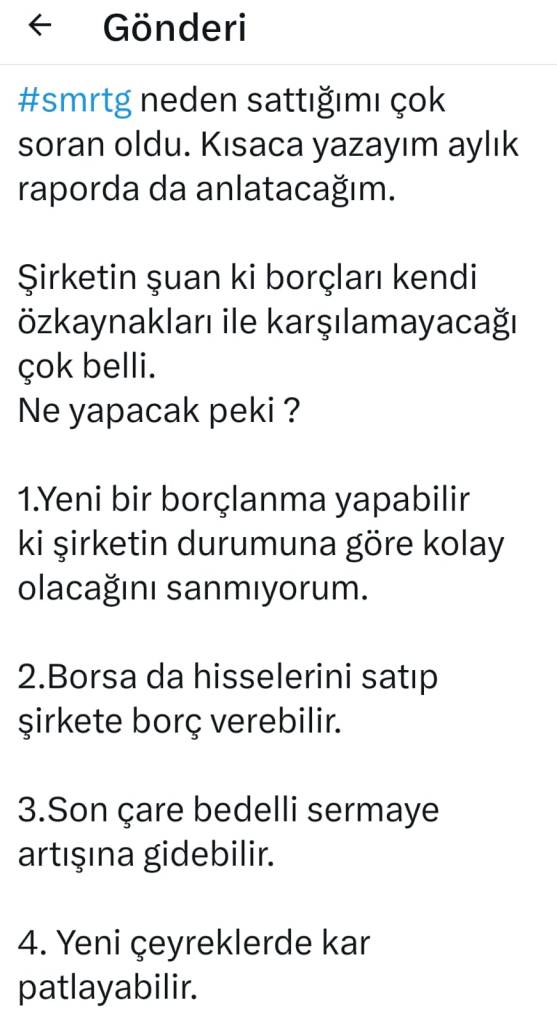 Bunun yanı sıra, şirketin büyüme stratejisi nedeniyle artan borçlarını ödemekte zorlanabileceğini düşünüyordum. Bu yüzden elimde kalan tüm payları 38 TL seviyesinden sattım. İlk maliyet satışımı 100 TL seviyesinden yapmıştım. Bu borçlarla ilgili X’te şöyle bir gönderi yayınladım :