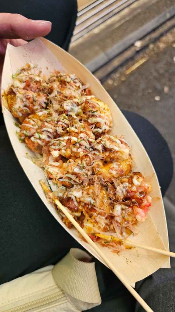 Takuyaki : Dotonboriyi dolaşırken sıra olan bir yer görürseniz bilin ki orası meşhur Takuyaki satan yer. İçi ahtapot parçalı, hamur işi bir top şeklinde atıştırmalık. Tadı içinde ahtapot olmasına rağmen çok iyi. Yerken dikkat edin, aşırı sıcaktır. Ağzınızı çok rahat yakarsınız. Biz Tokyo’da da denemiştik ama en çok burada beğendik. Zaten buradan yayılmış.
