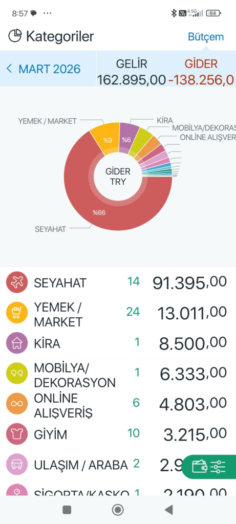 Japonya seyahat harcamalarımızın büyük bir kısmı bu ay bitti. Ama göreceğiniz üzere seyahat harcamalarımızın bu ayında en büyük harcaması. Nedeni Güney Kore-Japonya-Bali- Kuala Lumpur için uçak bileti aldım. Yazın bir ayını bu ülkelerde geçireceğiz. Japonya’ya evet yeni gittik ama gerçekten doyamadık. O yüzden bir daha gideceğiz. Bu kadar yüksek ulaşım harcamasına rağmen hala tasarruf edebiliyor olmak gerçekten çok iyi bir his.